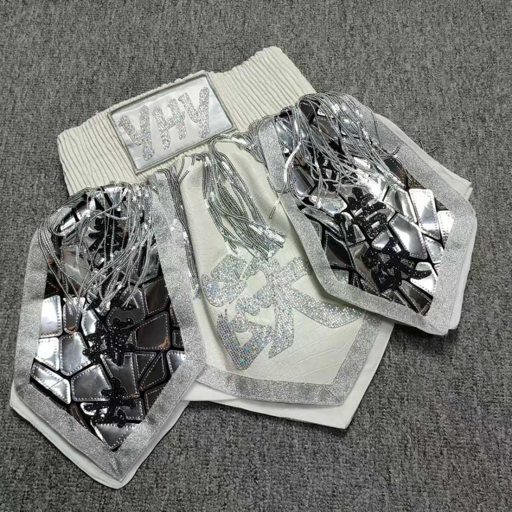 | Design Elements | - Silver metallic mosaic-patterned panels on leg areas- Silver glitter trim along panel edges- White elastic waistband with satin-like patch (for branding/customization)- Textured white base fabric with subtle sheen |