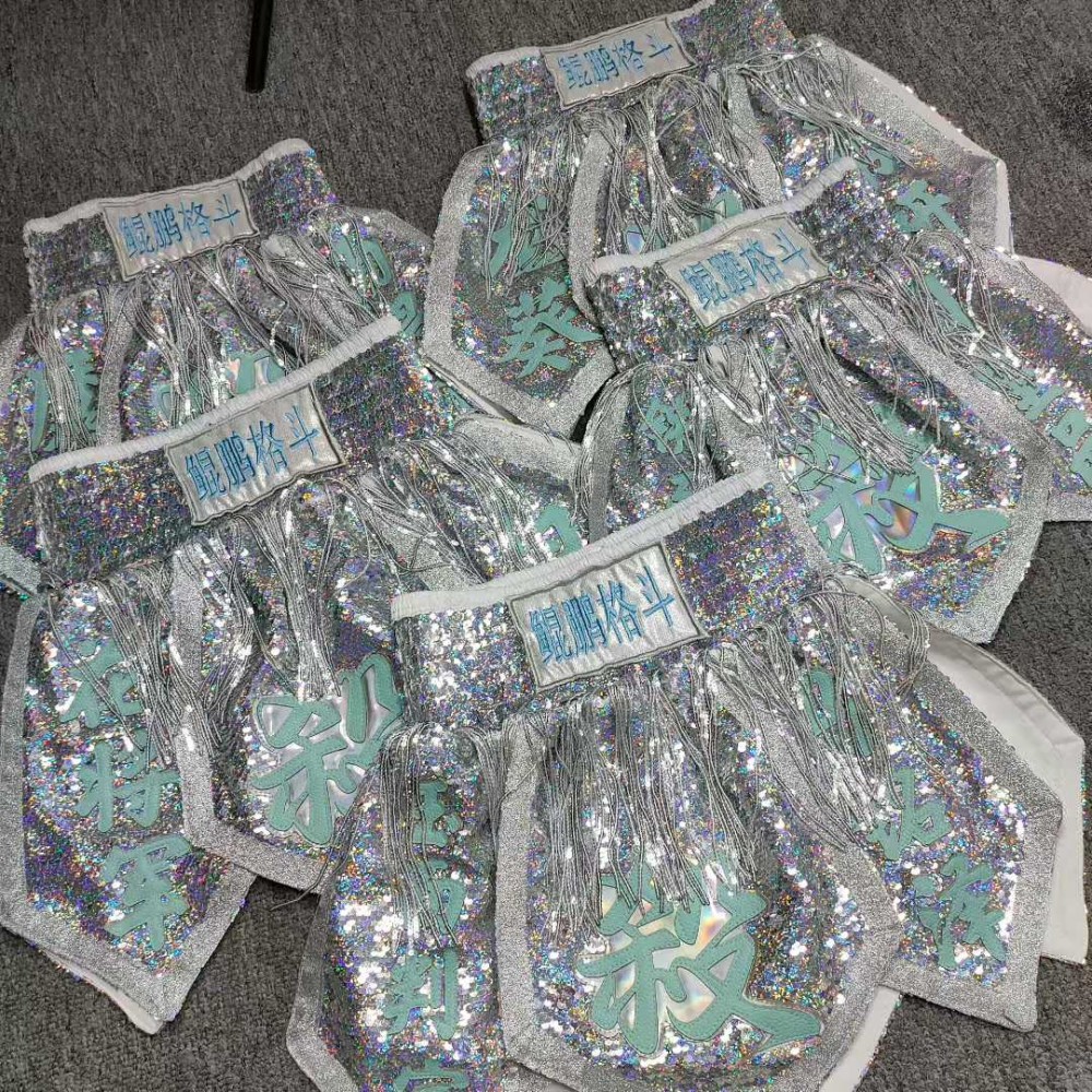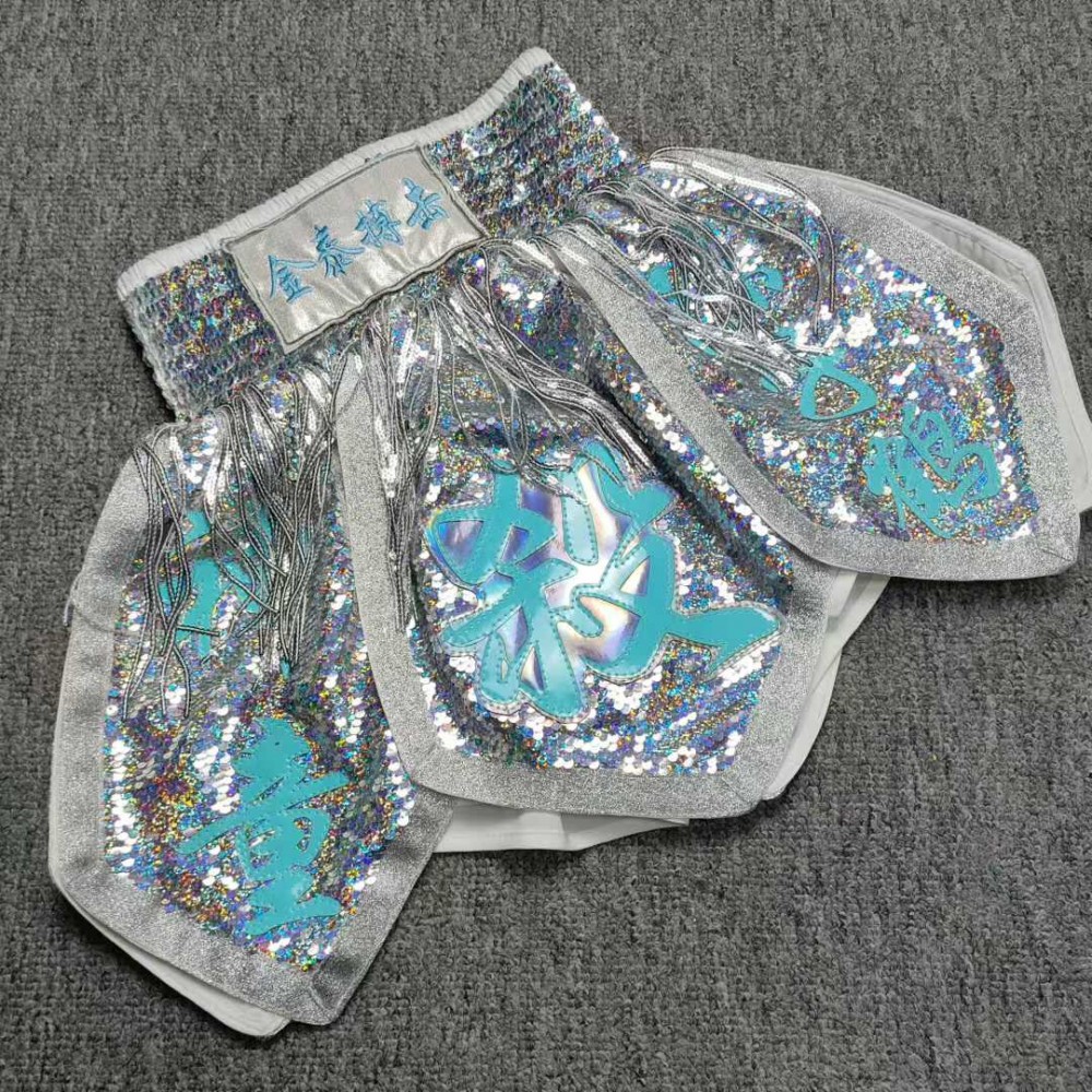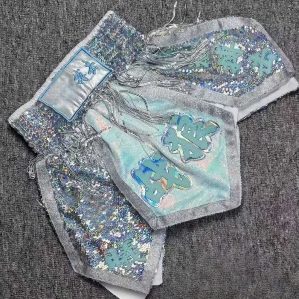 Style CharacteristicsFusion of holographic glamour (sequins, fringe) and Chinese cultural elements (embroidered characters), delivering a distinctive, eye-catching aesthetic for fighters wanting to blend style and heritage