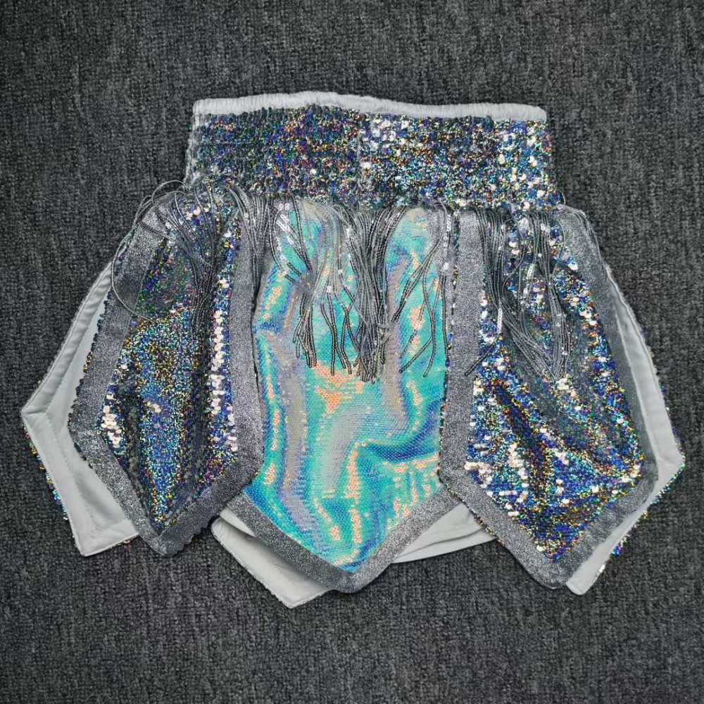NameSilver Holographic Sequin Boxing Shorts with Chinese Character Accents & Fringe