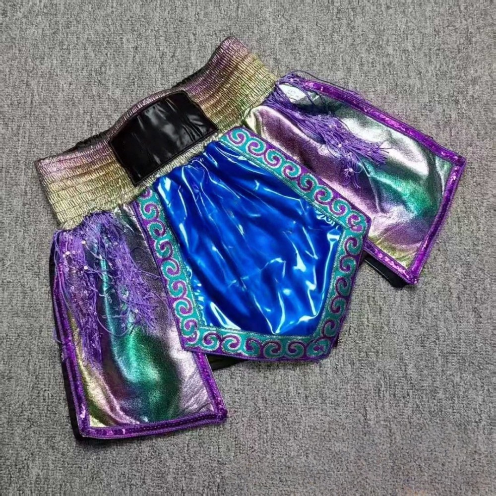 | Name | Rainbow Holographic Muay Thai Shorts with Purple Fringe & Ornate Trim |