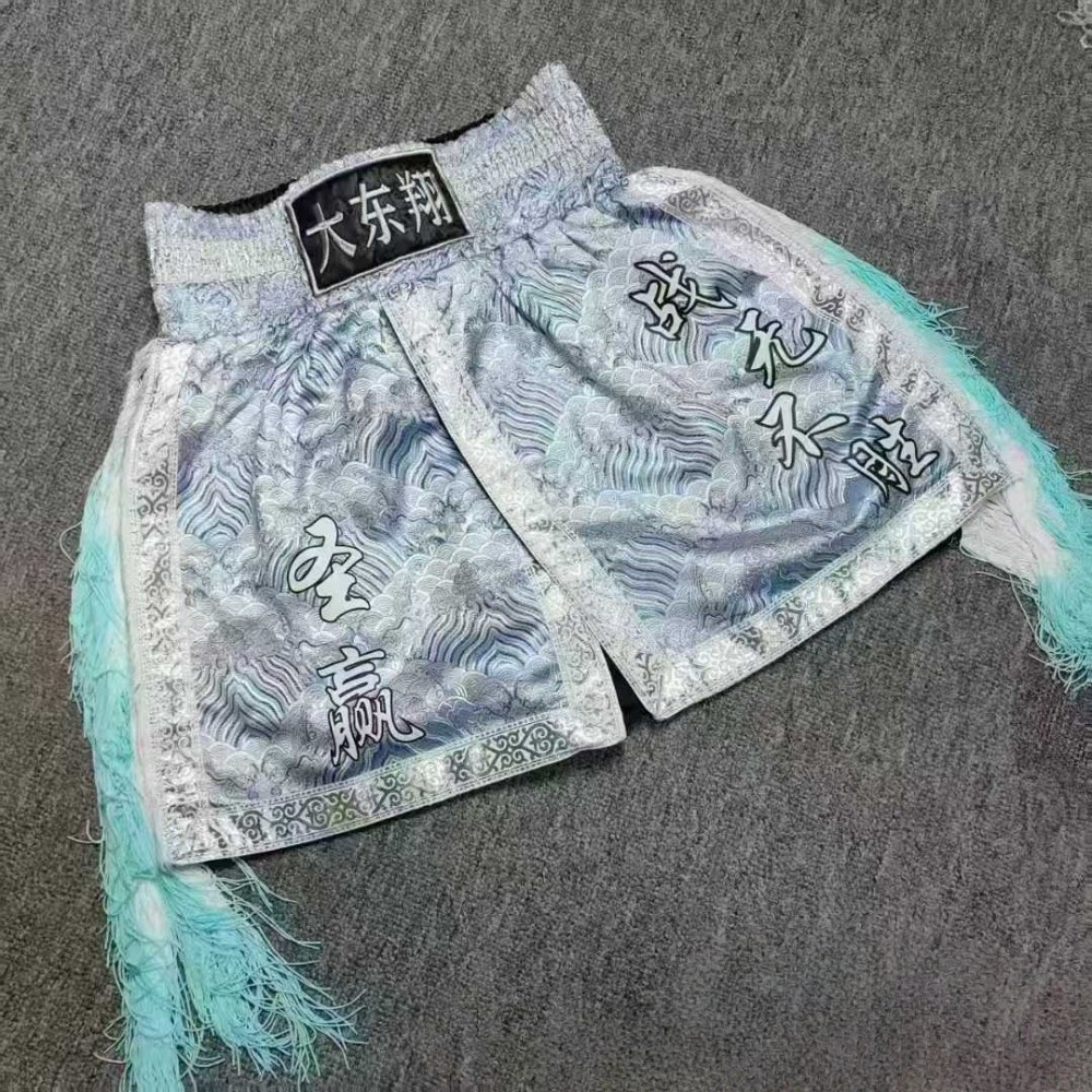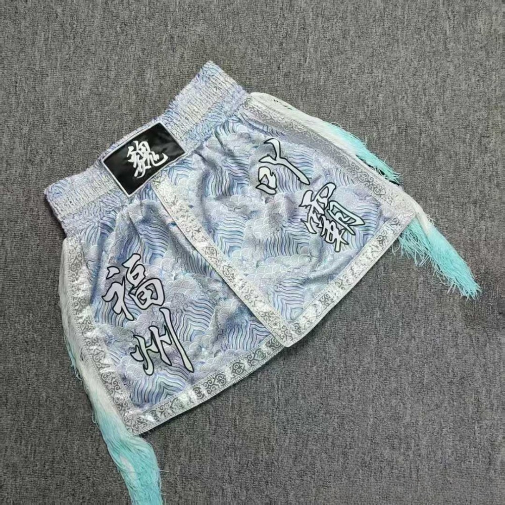 | Name | Light Blue Holographic Muay Thai Shorts with Chinese Character Accents & Turquoise-White Fringe |