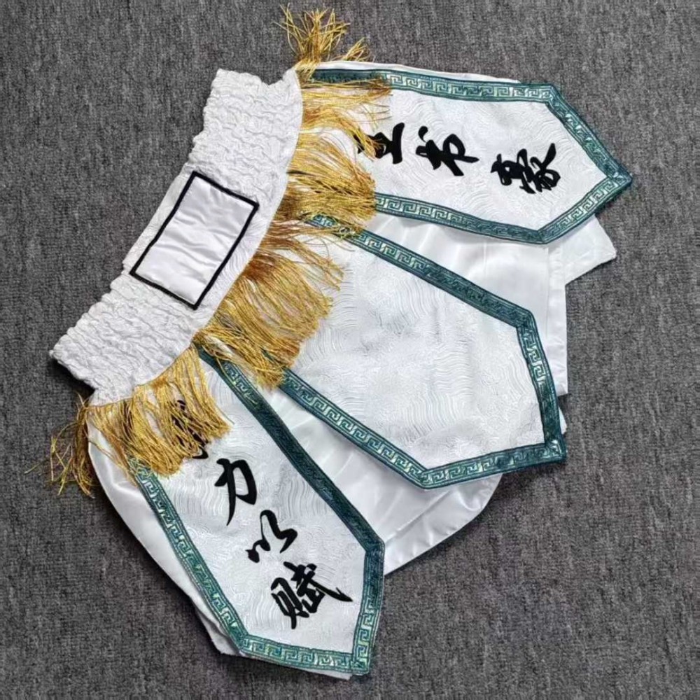 | Style Characteristics | Fusion of white brocade elegance, Chinese character symbolism (combat, speed, peace), and gold/green accents, delivering a refined yet meaningful aesthetic for fighters seeking cultural depth and ring distinction |