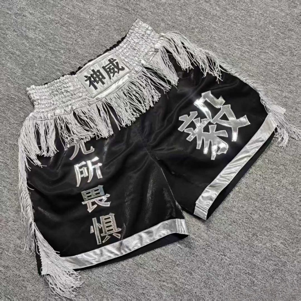 Style CharacteristicsFusion of black sleekness, silver opulence, and Chinese character symbolism (strength, perseverance, fearlessness), delivering a bold, motivational aesthetic for fighters aiming to embody power and determination in the ring