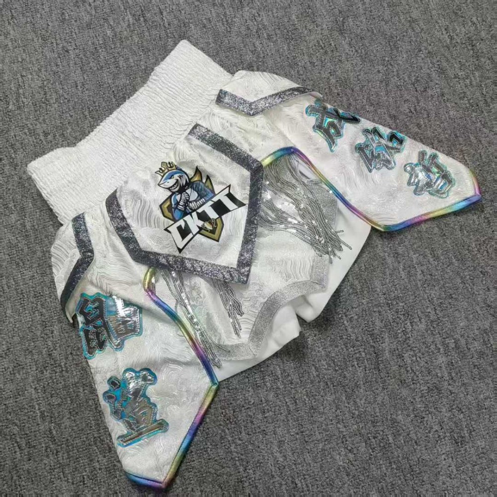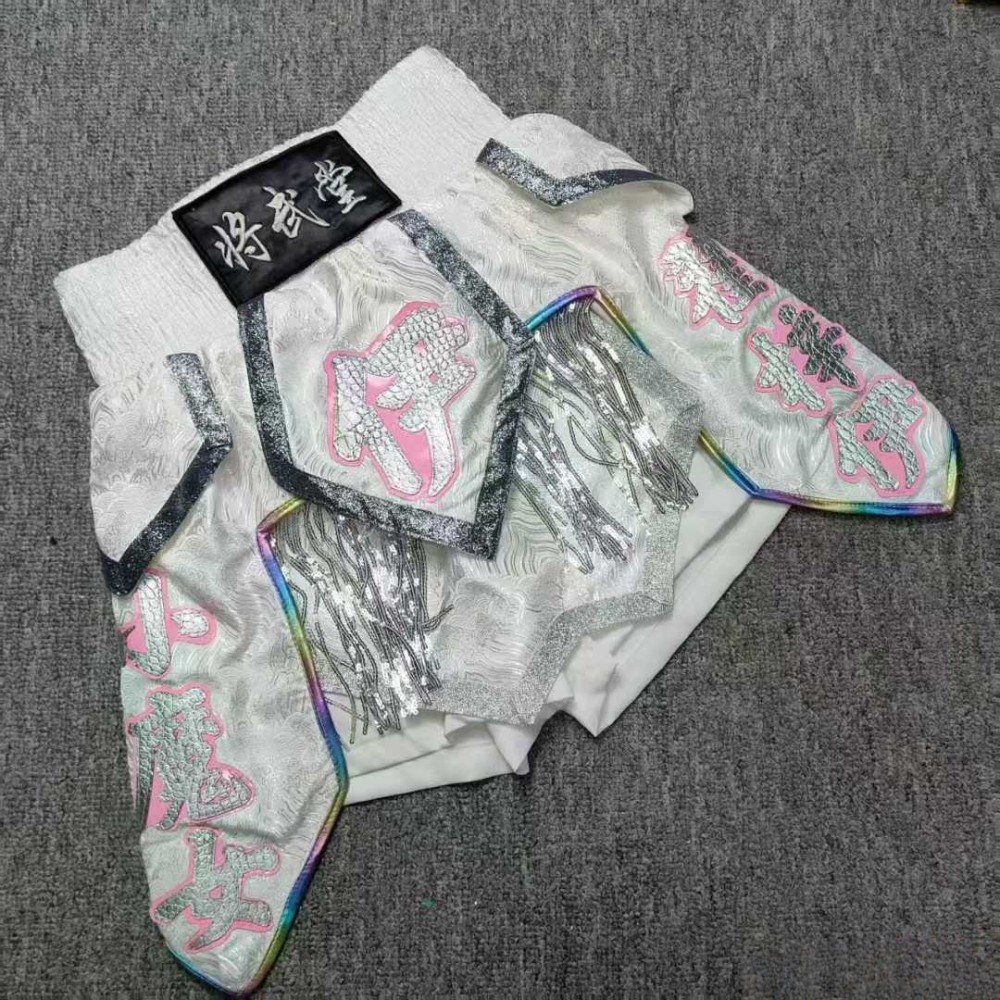 | Name | White Brocade Boxing Shorts Iridescent Trim Fight Trunks |