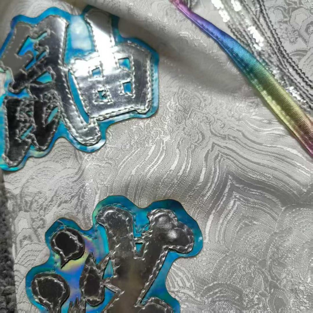 | Main Colors | White (brocade base), Silver (fringe and trim accents), Holographic/Iridescent (character and edge details), Black (text accents) |