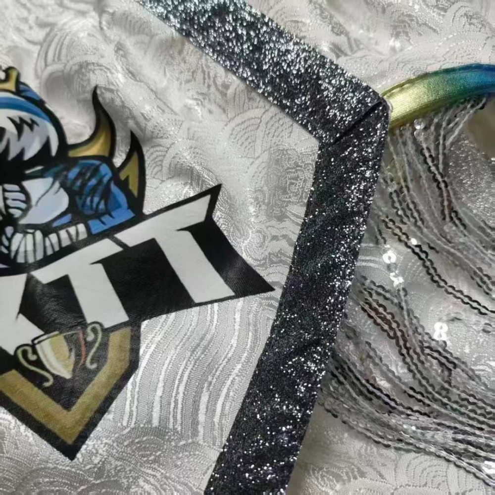 | Style Characteristics | Fusion of white brocade elegance, holographic/iridescent opulence, and Chinese character symbolism, delivering a futuristic yet traditional aesthetic for fighters seeking to stand out with cultural depth and visual flair |