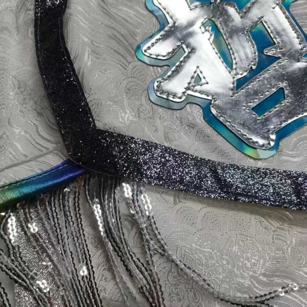 | Material | Ornate brocade fabric, holographic/iridescent accents, silver fringe, and printed text patches |