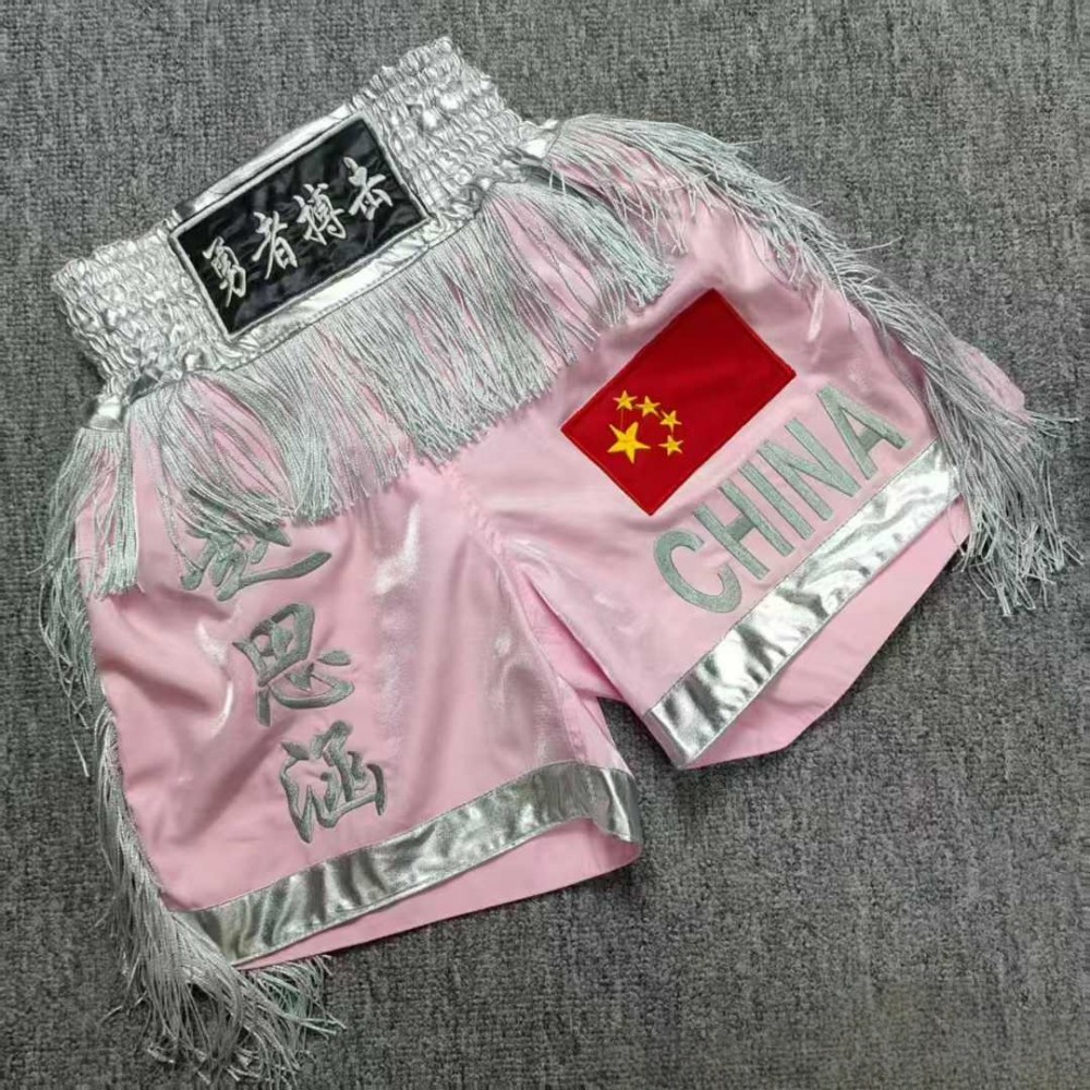 | Style Characteristics | Fusion of pink vibrancy, silver opulence, China national pride, and Chinese text symbolism (bravery, personal identity), delivering a bold, empowering aesthetic for fighters seeking to embody courage and cultural pride in the ring |