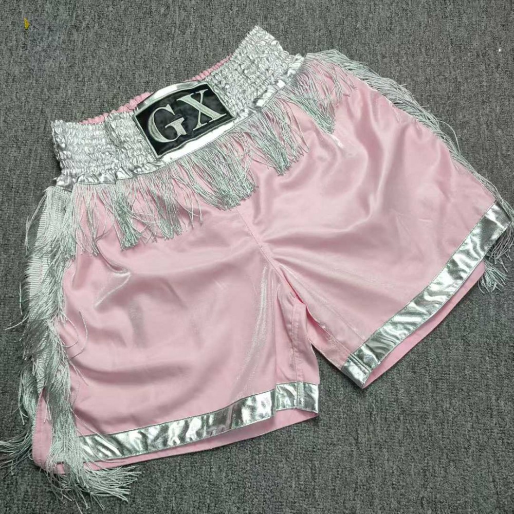 Custom Pink Boxing Trunks with Silver Fringe Kickboxing/Muay Thai Fight Gear for Fighters
