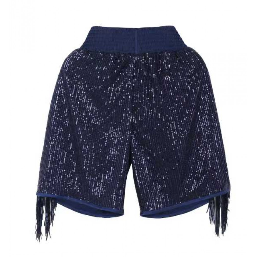 Navy Blue Sequin Boxing Shorts with Fringe