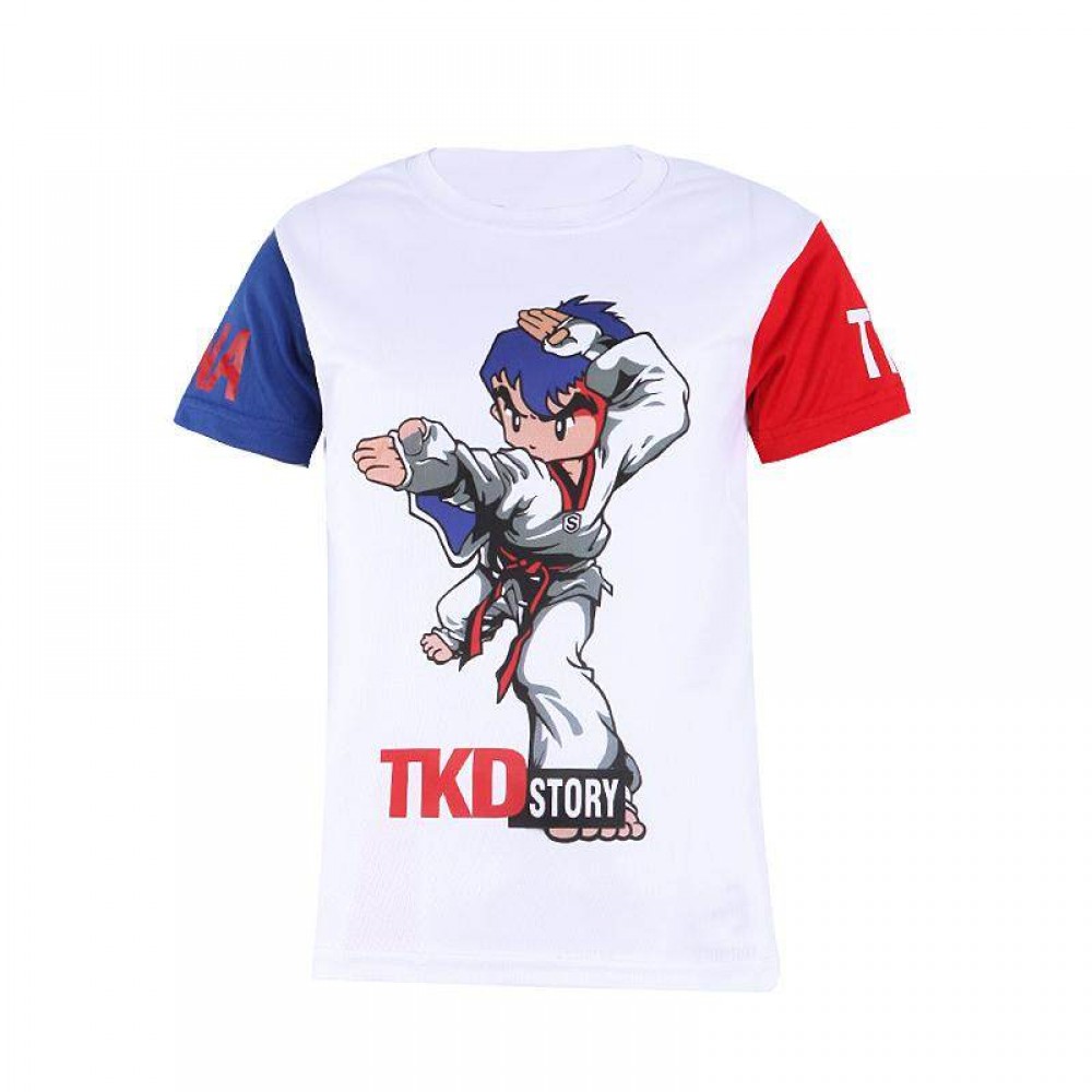 Quick-drying T-shirt with red and blue sleeves and a small figure print